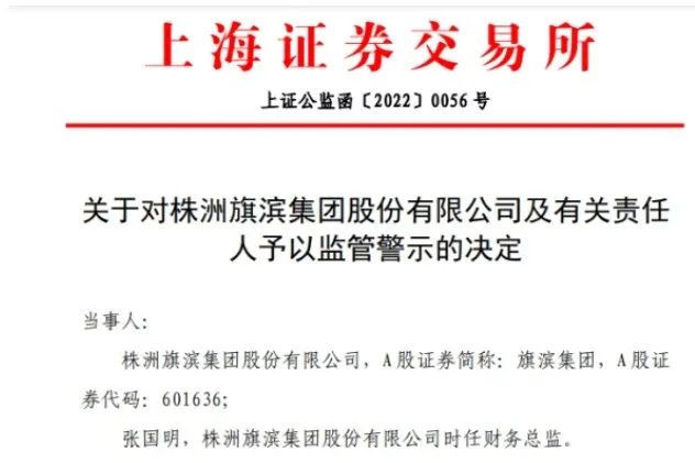 鉴于上述违规事实和情节,上海证券交易所上市公司管理一部作出如下监管措施决定:对株洲旗滨集团股份有限公司及时任财务总监张国明予以监管警示。
