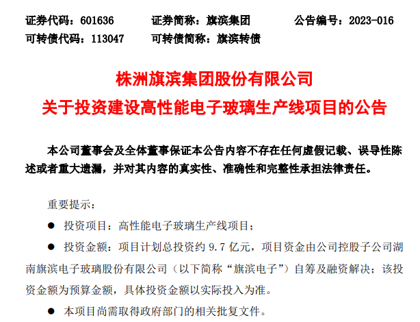3月4日,旗滨集团(601636)发布公告称,公司拟在四川省泸州市泸县经济开发区建设两条高性能电子玻璃生产线,项目计划总投资约9.7亿元。