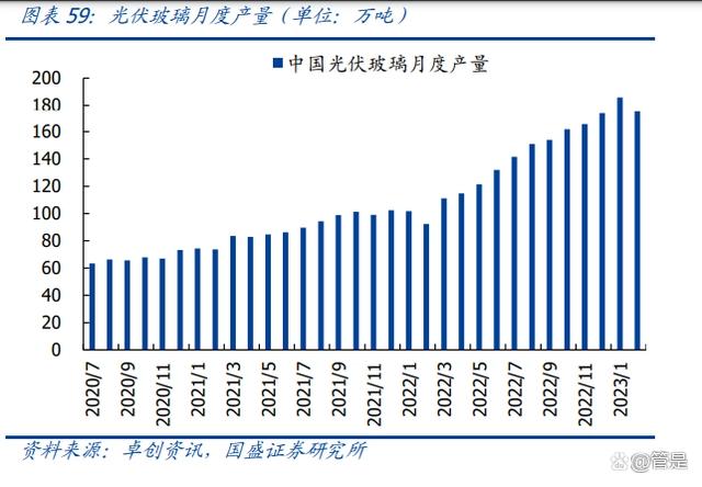 政策松绑下,光伏玻璃产能加速扩张。2021 年 7 月,工信部印发的《水泥玻璃行业产能置换实施办法》中指出,对光伏玻璃产能置换实行差别化政策,光伏压延玻璃项目可不制定产能置换方案。在政策松绑下,光伏玻璃产能迅速增加,截至 2023 年 2 月底,光伏玻璃窑炉共计 106 个,在产日熔量已达 81380 吨/天,2022 年初至今增加 40170 吨/天,2023 年 2 月单月产量达 175.12 万吨,同比增长 89.7%。