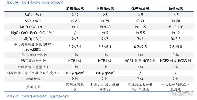 目前药用玻璃市场呈现两大趋势:1)一致性评价下,中硼硅玻璃渗透率提升;2)中硼硅玻璃管国产替代加速。药用玻璃市场趋势 1:一致性评价推动中硼硅玻璃渗透率提升。中硼硅玻璃为国际主要采用的玻璃材料,国内仍以低硼硅玻璃为主。中硼硅玻璃抗热冲击性能及耐水性能优异,是国际大量采用的医用玻璃材料,用于各种针剂、血液、疫苗等药品的包装。低硼硅玻璃为国内自主研发,在国际上并无此产品分类,其耐热冲击性能已经耐水性均弱于中硼硅玻璃,主要用于化学稳定性要求不高的药品,在国内应用最为广泛。钠钙玻璃耐水性及抗热冲击性能差,适用于一次性输液瓶或口服液瓶,高硼硅玻璃抗热冲击性能和耐水性能最佳,但封口较为困难,作为药用玻璃的应用少。