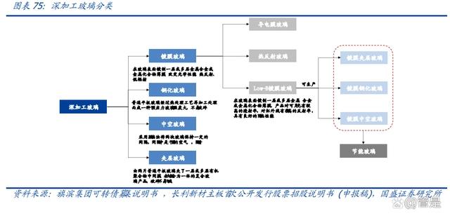节能玻璃是浮法玻璃下游的深加工应用,深加工玻璃是由玻璃加工企业根据下游应用的具体要求,对浮法玻璃进行二次加工,包括镀膜玻璃、钢化玻璃、中空玻璃、夹层玻璃等,其中镀膜玻璃可进一步分为 Low-E 镀膜玻璃、热反射玻璃、导电膜玻璃等。节能玻璃是指具备 Low-E 镀膜玻璃大板生产能力的企业,将浮法玻璃镀膜成大板后,再进一步深加工为中空玻璃、夹层玻璃、钢化玻璃等节能玻璃产品。