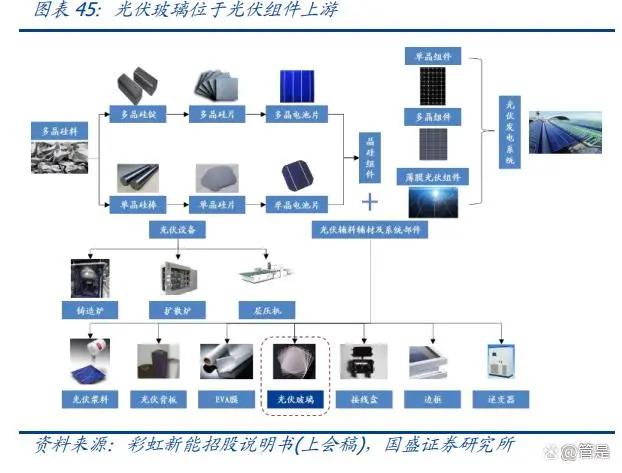光伏玻璃作为光伏组件的上游原料,其强度、透光率等直接决定光伏组件的寿命和发电效率。光伏玻璃主要应用于太阳能光伏组件外部的面板和背板玻璃,与其他光伏组件(EVA 膜层、TPT 和边框等)共同构成太阳能光伏电池板,光伏玻璃经镀膜后可提高光线透过率,使太阳能电池片产生更多电能,同时经钢化处理的光伏玻璃强度更高,可以使太阳能电池片承受更大的风压及较大的昼夜温差变化,因此光伏玻璃是光伏组件不可缺少的件之一。
