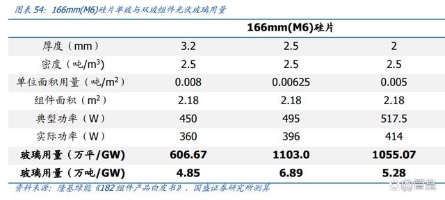 双玻渗透率攀升下,光伏玻璃需求显著提升。根据我们测算,以 166mm 尺寸(M6)为例,假设双玻组件发电增益为 15%,实际运行功率为典型功率的 80%,则 3.2mm 单玻组件用量为 4.85 万吨,而 2.5mm、2mm 双玻组件用量分别为 6.89、5.28 万吨,较 3.2mm 单玻组件用量分别提高 42.0%、8.7%。