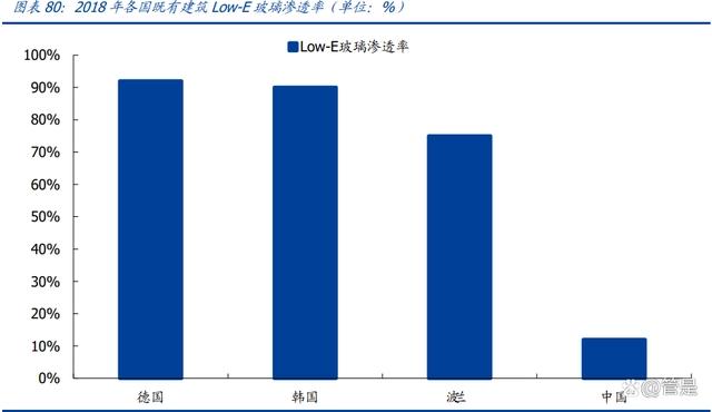我国节能玻璃渗透率较低,政策支持下有较大提升空间。以 Low-E 玻璃为例,2018 年德国建筑领域 Low-E 玻璃使用率达到 92%,韩国和分别为 90%和 75%,而我国既有建筑 Low-E 玻璃使用率仅 12%左右,相比欧发达国家仍有较大的提升空间。 2021 年住建部《建筑节能与可再生能源利用通用规范》中指出,新建居住建筑和公共建筑平均设计能耗水平应在 2016 年执行的节能设计标准的基础上分别降低 30%和 20%。在顶层政策支持以及双碳背景下,节能玻璃需求不断增长。