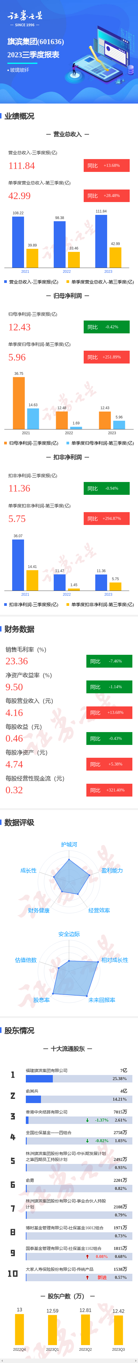证券之星消息,旗滨集团2023年三季报显示,公司主营收入111.85亿元,同比上升13.68%;归母净利润12.43亿元,同比下降0.42%;扣非净利润11.37亿元,同比下降0.94%;其中2023年第三季度,公司单季度主营收入43.0亿元,同比上升28.48%;单季度归母净利润5.96亿元,同比上升251.89%;单季度扣非净利润5.75亿元,同比上升294.87%;负债率53.42%,投资收益224.18万元,财务费用1.01亿元,毛利率23.36%。