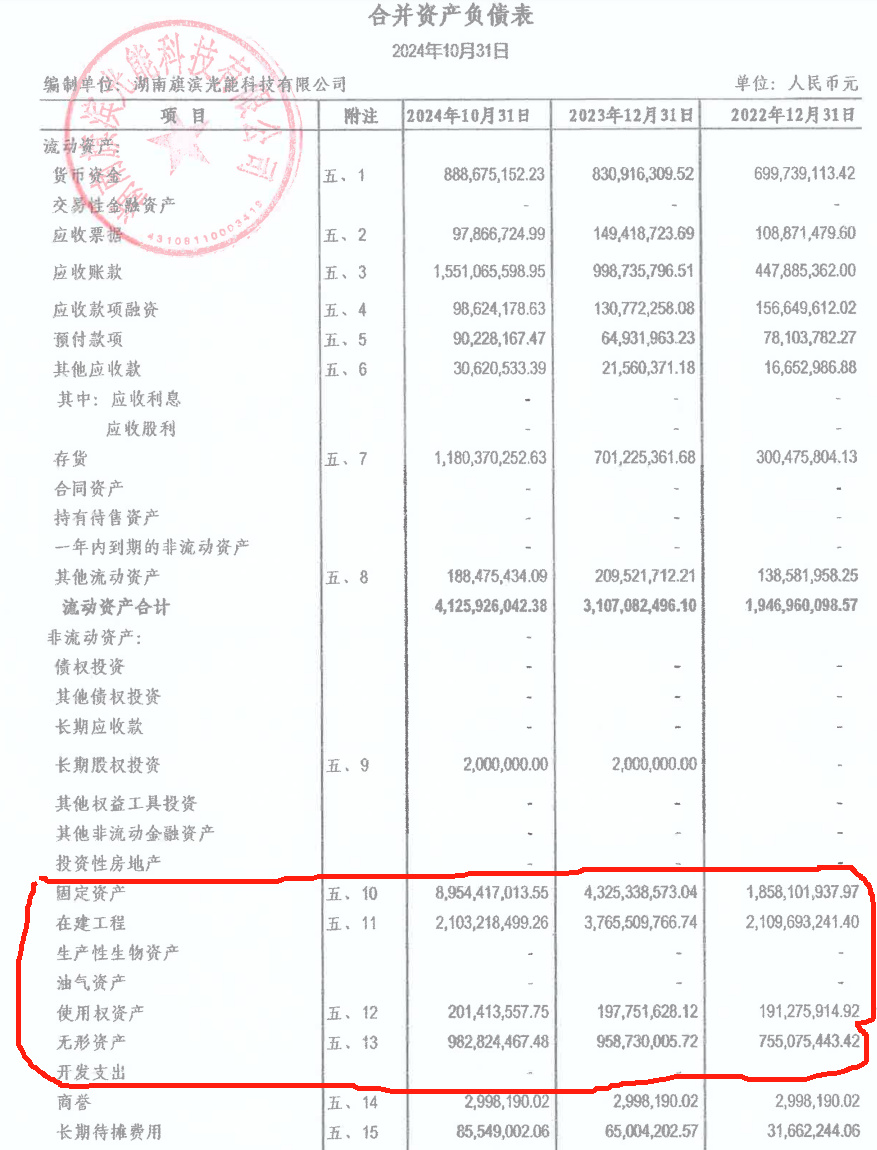 这也导致旗滨光能的资产快速膨胀。2022年至2024年10月底,旗滨光能各期末应收账款分别为4.48亿元、9.99亿元和15.51亿元,固定资产分别为18.58亿元、43.25亿元和89.54亿元,在建工程分别为21.1亿元、37.66亿元和21.03亿元。从其固定资产及在建工程近几年变动看,标的公司2023年开始处于光伏产能投放的快速增长期。