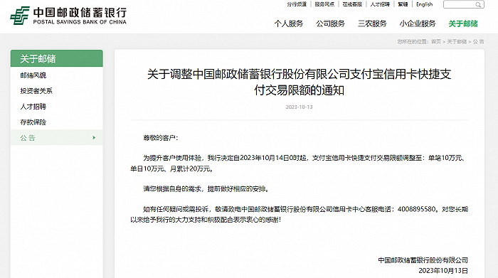 邮政储蓄银行10月13日发布通知,为提升客户使用体验,决定自2023年10月14日0时起,支付宝信用卡快捷支付交易限额调整至:单笔10万元、单日10万元、月累计20万元。