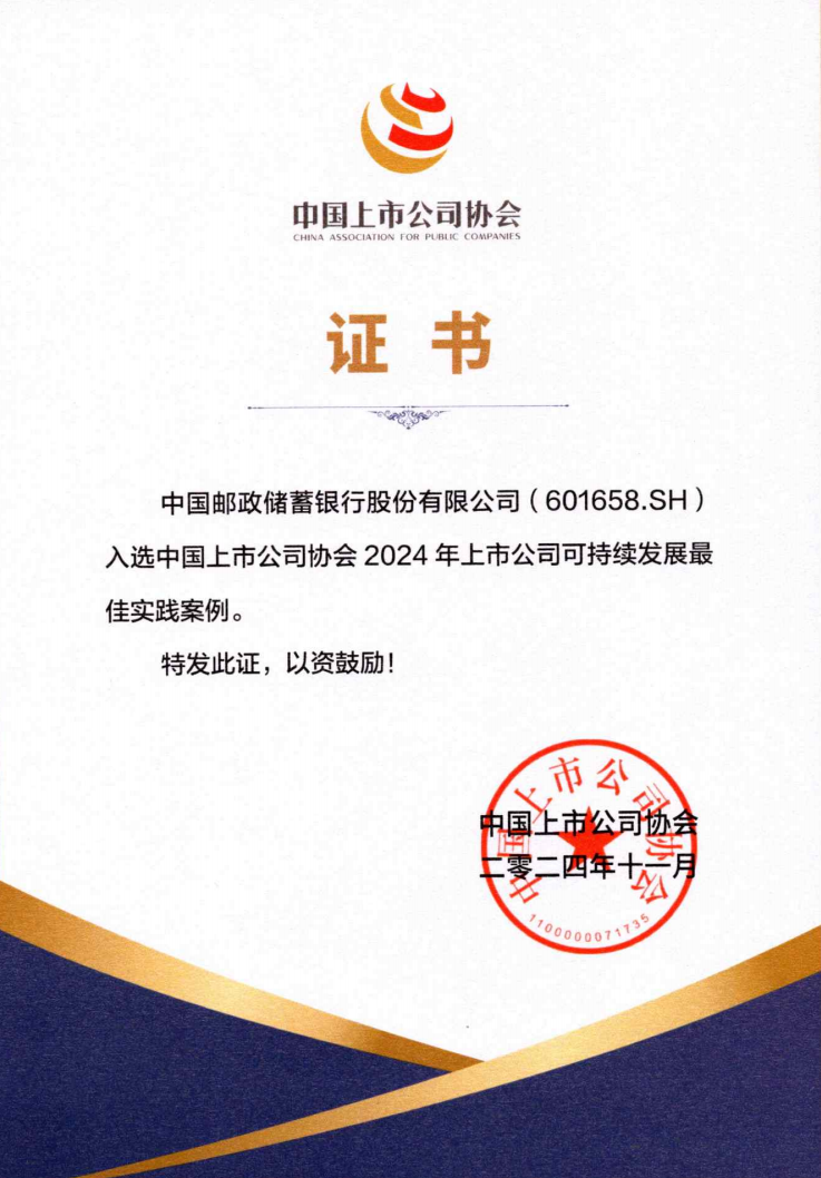 近日,中国上市公司协会发布“2024上市公司可持续发展实践案例征集活动”结果,中国邮政储蓄银行荣获“最佳实践案例”。这是邮储银行在2022年、2023年获得ESG最佳实践案例后,再次获得可持续发展最佳实践案例。