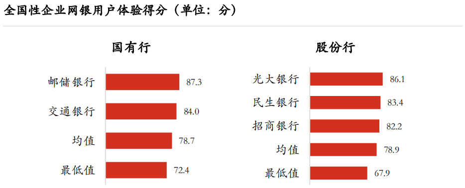 《报告》显示,邮储银行企业网银用户体验评测总得分87.3分,位居行业第一名。其中,专家体验得分表现出色,位居榜首。在网银安装、日常登录、跨行转账、回单查询下载、复核授权等用户高频使用功能测试中,邮储银行企业网银操作成功率均为100%,表现亮眼。此外,邮储银行企业网银的服务保障和安全保障双双获得满分,为客户线上资金交易安全保驾护航。