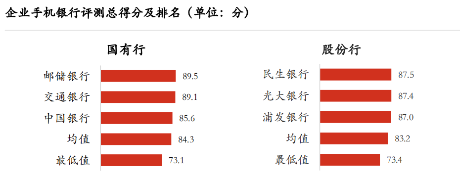 《报告》针对商业银行的企业手机银行,围绕“用户运营”“服务保障”“服务能力”和“用户体验”开展综合评测,邮储银行总得分89.5分,位居行业第一名,在新用户比例、安全保障、功能实现率、新用户体验和专家体验等细分维度上,均处于行业优秀水平。
