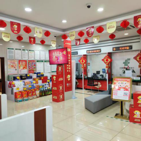 邮储银行遍布各地的网点内外,披上节日的盛装,以红灯笼高挂、红福字贴门、红年画点缀,这些满载传统韵味的装饰将厅堂装点得年味四溢。