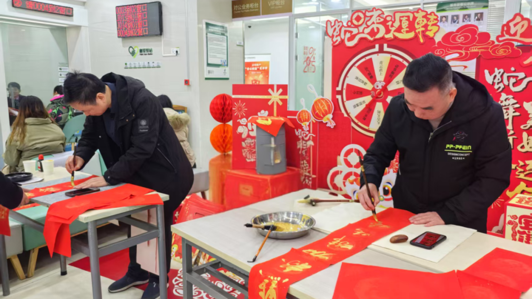 在上海,邮储银行崇明区支行营业部邀请崇明区书画协会书法家和书法爱好者到网点开展迎春送“福”活动,在厅堂现场挥洒笔墨,为前来办业务的客户送上对联、福字和新春的祝福。