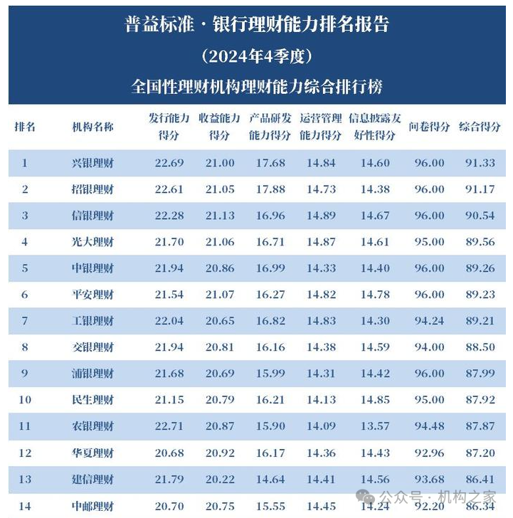 此外,根据普益标准2024年四季度银行理财综合评分,中邮理财在全国性理财机构理财能力综合排行榜中位列第十四,综合得分86.34分。这评分由发行能力、受益能力、产品研发能力等综合而成。其中中邮理财在运营能力管理方面较强,在全国性同业中位列第七;不过在信披披露和评估问卷方面分别位列十九和十八。此外,该行在发行能力方面排第十三,收益能力方面排第十五,产品研发能力排第十三。邮储银行本身作为全国性大行,且坐拥海量零售客户,背靠集团优势的中邮理财仍有潜力待挖掘。