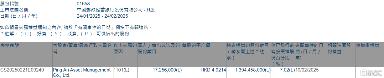 根据联交所最新权益披露资料显示,2025年2月19日,邮储银行(01658.HK)获Ping An Asset Management Co., Ltd.在场内以每股均价4.9214港元增持1725.6万股,涉资约8492.37万港元。