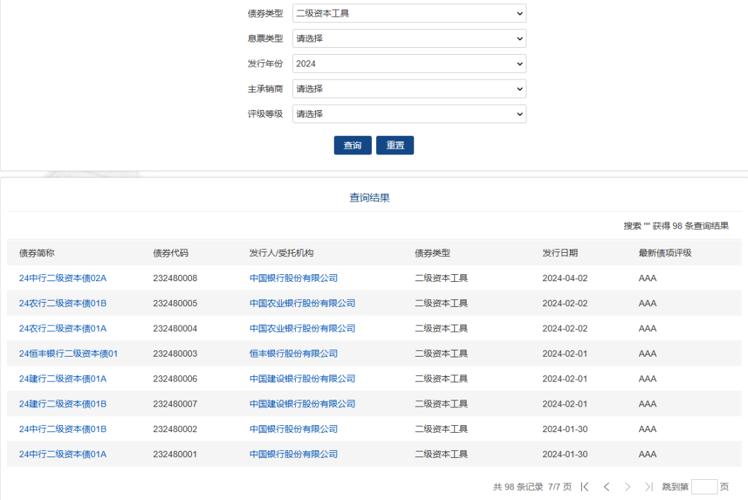 与之相比,去年同期数据显示,2024年1-2月,有包括中国银行、建设银行、恒丰银行、农业银行等在内的商业银行累计发行7笔二级资本债,合计实际发行规模达1900亿元。其中,有6笔由中国银行、农业银行、建设银行三家国有大行发行,累计实际发行规模为1800亿元,占比达到95%。不过,该两个月份均未发行永续债。