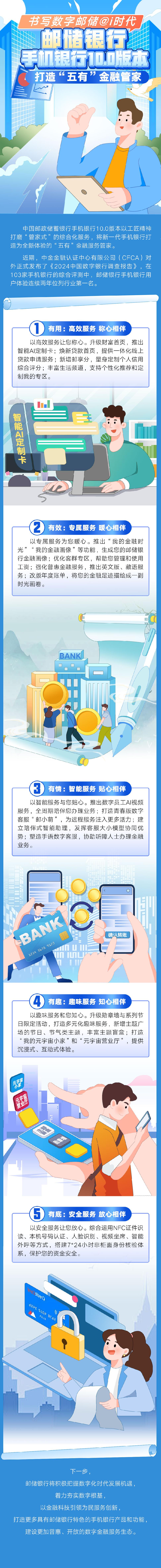 在数字经济蓬勃发展的时代浪潮下,手机银行已然成为银行提升竞争力、优化服务体验的关键路径。近期,中金金融认证中心有限公司(CFCA)对外正式发布了《2024 中国数字银行调查报告》,在对103家手机银行的综合评测中,邮储银行手机银行脱颖而出,用户体验连续两年位列行业第一名。中国邮政储蓄银行手机银行10.0版本以“邮@i,全10现”为主题,以“有”为关键词,探索智能技术与金融业务的深度融合,打造为全新体验的“五有”金融服务管家。