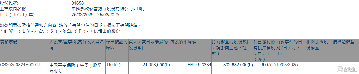 格隆汇3月25日丨根据联交所最新权益披露资料显示,2025年3月19日,邮储银行(01658.HK)获中国平安保险(集团)股份有限公司在场内以每股均价5.3234港元增持2109.8万股,涉资约1.12亿港元。
