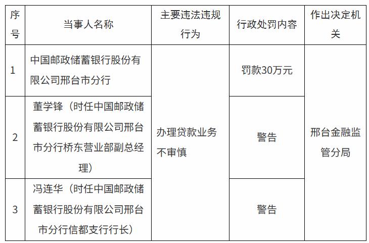 近期,邮储银行频频违规被罚。4月29日,国家金融监督管理总局邢台监管分局行政处罚信息公开表显示,中国邮政储蓄银行邢台市分行因办理贷款业务不审慎,被罚款30万元。因办理贷款业务不审慎,时任中国邮政储蓄银行邢台市分行桥东营业部副总经理董学锋、时任中国邮政储蓄银行邢台市分行信都支行行长冯连华分别被警告。