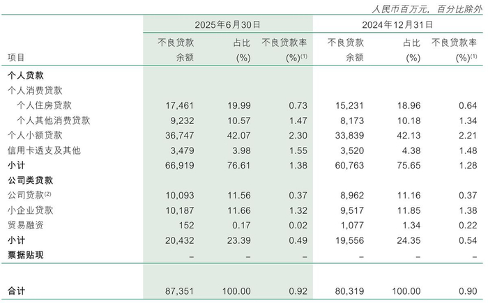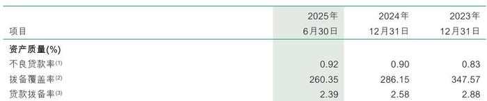 截至2025年6月末,邮储银行的不良贷款率为0.92%,较2024年末提升0.02个百分点,是国有六大行中唯一不良贷款率上涨的银行,不良贷款金额约873.51亿元;截至同期末的逾期率为1.24%,亦较上年末提升0.05个百分点。