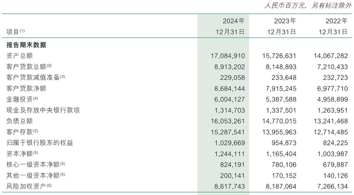 2022年、2023年和2024年末,邮储银行的资产总额分别为14.07万亿元、15.73万亿元和17.08万亿元,资产规模虽然呈持续扩张态势,但增速却由2022年11.75%的双位数增长,降至2024年的8.64%。