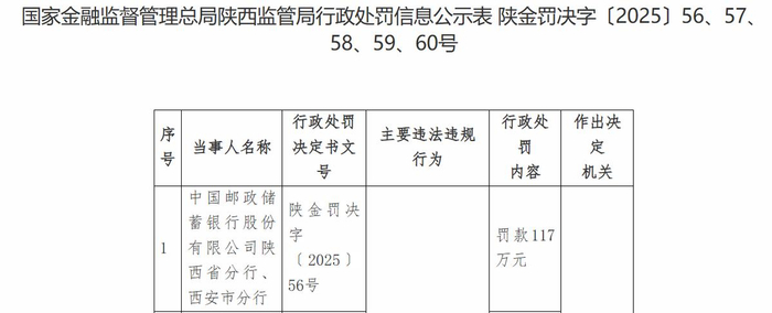 9月8日,邮储银行陕西省分行、西安市分行又因固定资产贷款管理不审慎、个人贷款资金被挪用以及员工行为管理不到位等违规行为,被处以117万元罚款,而这已是该行2025年以来收到的第五张百万元级别罚单。
