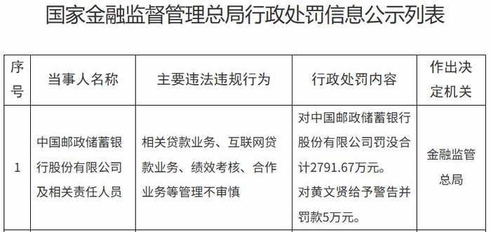 其中,中国邮政储蓄银行(HK:01658、SH:601658,下称“邮储银行”)因相关贷款业务、互联网贷款业务、绩效考核、合作业务等管理不审慎,被罚没合计2791.67万元。同时,相关责任人员黄文贤也被警告并罚款5万元。