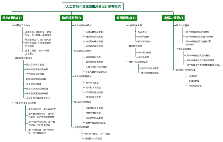 3.场景锚定:为确保测试与业务实际紧密结合,需将上述能力维度锚定于典型金融业务场景中。通过制定《“人工智能+”金融应用测试设计参考框架》,搭建从“理论标准”到“工程实践”的桥梁,从而确保测试设计框架兼具技术先进性与业务相关性。测试设计参考框架如图1所示。