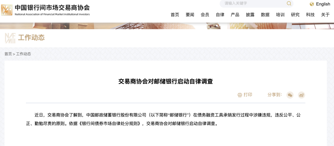 12月15日,银行间市场交易商协会一则公告引发关注:因在债务融资工具承销发行中涉嫌违反公平、公正、勤勉尽责原则,邮储银行被正式启动自律调查。