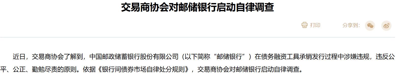 12月15日,银行间市场交易商协会(下称“交易商协会”)发布公告称,近日,交易商协会了解到,中国邮政储蓄银行股份有限公司(以下简称“邮储银行”)在债务融资工具承销发行过程中涉嫌违规,违反公平、公正、勤勉尽责的原则。依据《银行间债券市场自律处分规则》,交易商协会对邮储银行启动自律调查。