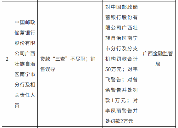 据国家金融监督管理总局广西监管局,因贷款“三查”不尽职;销售误导,邮储银行广西壮族自治区南宁市分行被罚50万。