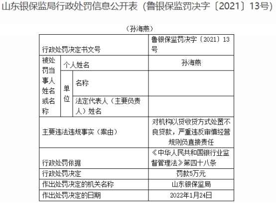 孙海燕对机构以贷收贷方式处置不良贷款,严重违反审慎经营规则负直接责任。根据《中华人民共和国银行业监督管理法》第四十八条,山东银保监局对其罚款5万元。