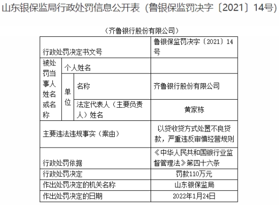中国银保监会网站日前披露的山东银保监局行政处罚信息公开表(鲁银保监罚决字〔2021〕13号、14号)显示,齐鲁银行股份有限公司以贷收贷方式处置不良贷款,严重违反审慎经营规则。根据《中华人民共和国银行业监督管理法》第四十六条,山东银保监局对其罚款110万元。