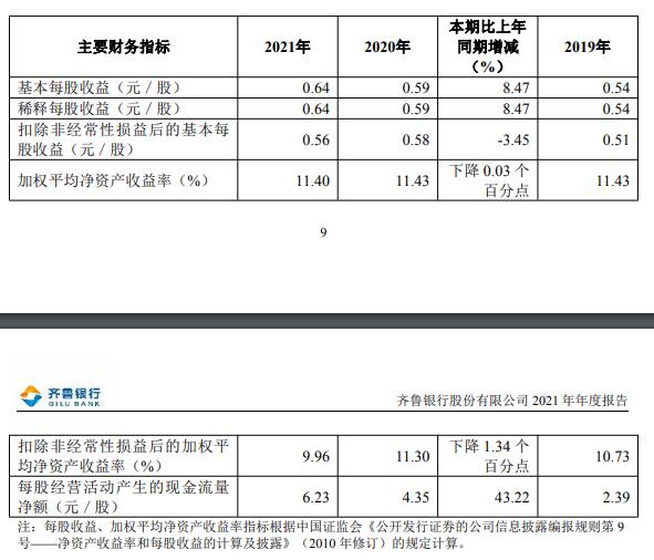2021年,齐鲁银行基本每股收益0.64元/股,同比增长8.47%;加权平均净资产收益率11.40%,比上年同期下降0.03个百分点;扣除非经常性损益后的加权平均净资产收益率9.96%,比上年同期下降1.34个百分点。