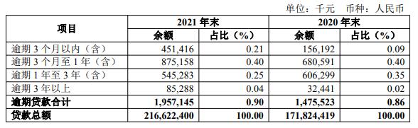 2021年末,齐鲁银行逾期贷款合计19.57亿元,较上年末增加4.82亿元,逾期贷款占贷款总额比例为0.90%,较上年末增加0.04个百分点,新增逾期贷款主要由部分存量不良贷款借款人还款意愿下降而形成,逾期贷款规模整体可控。