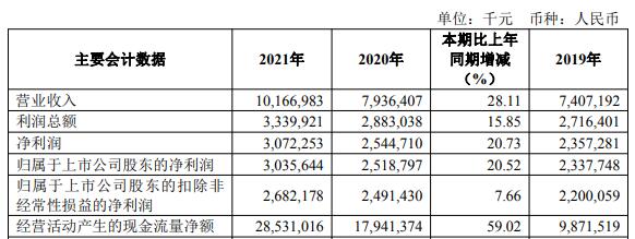 2021年,齐鲁银行实现营业收入101.67亿元,同比增长28.11%;净利润30.72亿元,同比增长20.73%;归属于上市公司股东的净利润30.36亿元,同比增长20.52%;归属于上市公司股东的扣除非经常性损益的净利润26.82亿元,同比增长7.66%;经营活动产生的现金流量净额285.31亿元,同比增长59.02%。