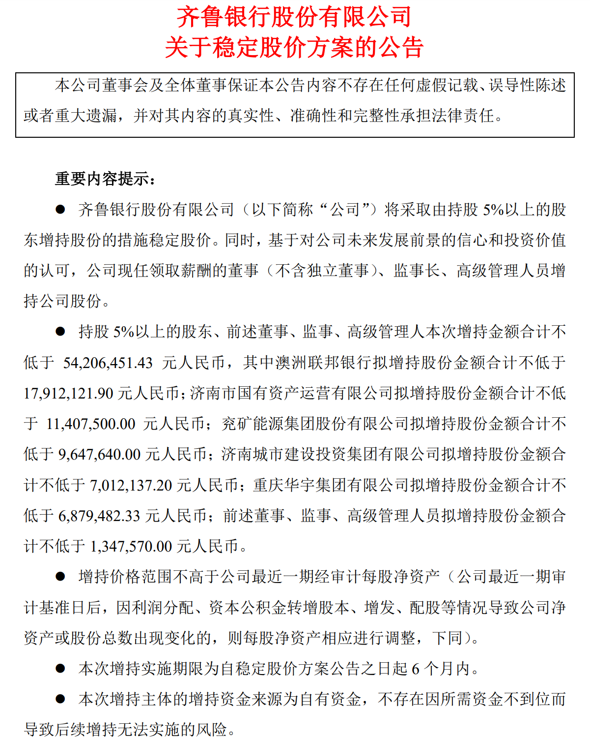 从增持股份金额来看,澳洲联邦银行拟增持不低于1791.21万元,济南市国有资产运营有限公司拟增持不低于1140.75万元,兖矿能源集团股份有限公司拟增持不低于964.76万元,济南城市建设投资集团有限公司拟增持不低于701.21万元,重庆华宇集团有限公司拟增持不低于687.95万元;黄家栋、张华、李九旭、葛萍、陶文喆、胡金良、刘振水、吴刚等8名董事、监事、高级管理人员拟增持合计不低于134.76万元。本次增持金额合计不低于5420.65万元。
