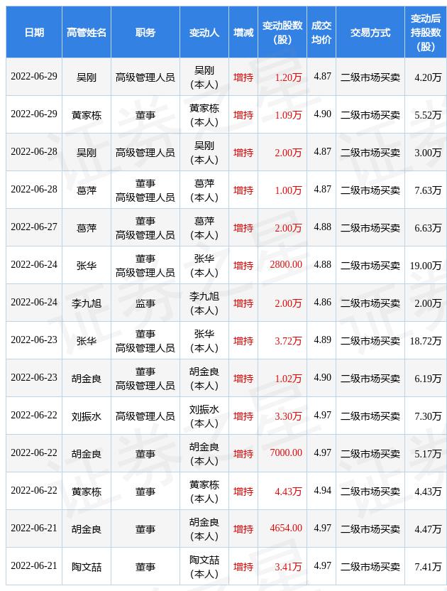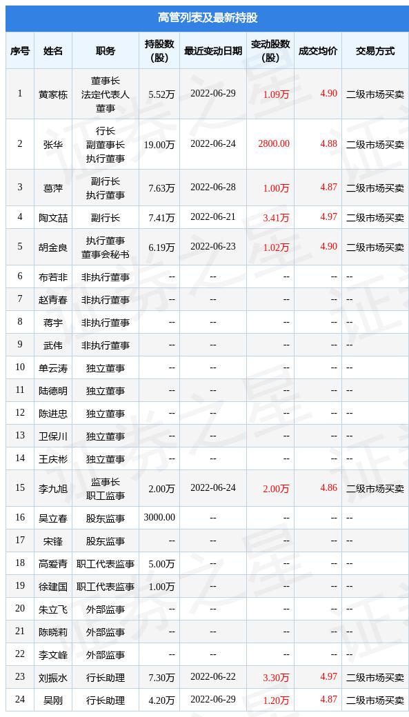 根据 6 月 30 日市场公开信息、上市公司公告及交易所披露数据整理,齐鲁银行(601665)最新董监高及相关人员股份变动情况:2022 年 6 月 29 日公司董事黄家栋、高级管理人员吴刚共增持公司股份 2.29 万股,占公司总股本为 0.0005%。变动期间公司股价下跌 0.41%,6 月 29 日当日收盘报 4.88 元。