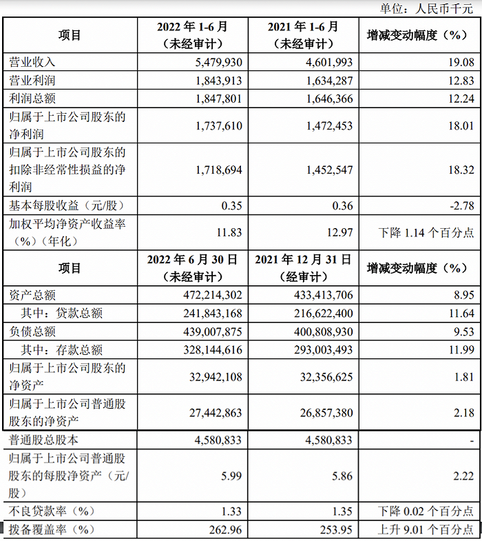 齐鲁银行7月21日发布2022年半年度业绩快报,2022年上半年,银行实现营业收入54.8亿元,同比增长19.08%;实现归属于上市公司股东的净利润17.38亿元,同比增长18.01%。截至2022年半年末,该行资产总额4,722.14亿元,较年初增加388.01亿元,增长8.95%;贷款总额2,418.43亿元,较年初增加252.21亿元,增长11.64%;存款总额3,281.45亿元,较年初增加351.41亿元,增幅11.99%。截至2022年半年末,该行不良贷款率1.33%,较年初下降0.02个百分点;拨备覆盖率262.96%,较年初提高9.01个百分点。
