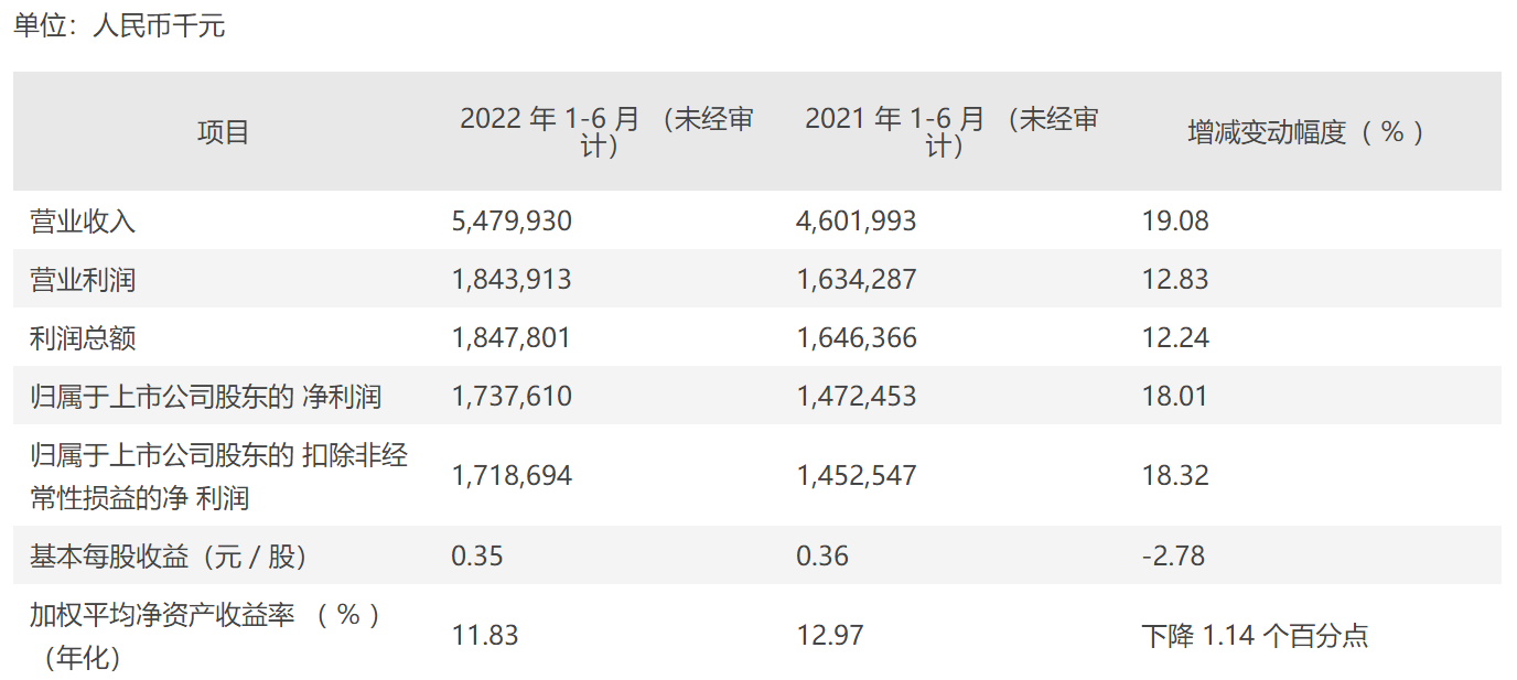 2022年上半年,齐鲁银行实现营业收入54.80亿元,同比增长19.08%;实现归属于上市公司股东的净利润17.38亿元,同比增长18.01%。