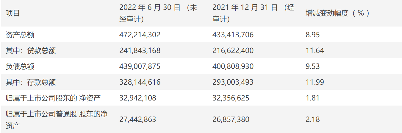 齐鲁银行表示,截至2022年半年末,该行资产总额4722.14亿元,较年初增加388.01亿元,增长8.95%;贷款总额2418.43亿元,较年初增加252.21亿元,增长11.64%;存款总额3281.45亿元,较年初增加351.41亿元,增幅11.99%。