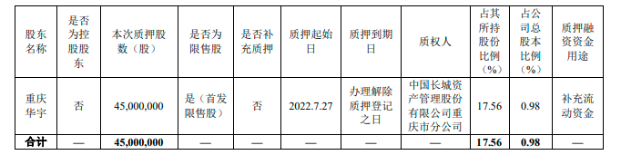 据悉,本次质押股数为4500万股,占其所持股份比例17.56%,占公司总股本比例0.98%,质押时间自2022年7月27日至办理解除质押登记之日,质权人为中国长城资产管理股份有限公司重庆市分公司。