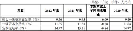 2022年末,齐鲁银行资本充足率为14.47%,比上年同期末下降0.84个百分点;一级资本充足率为11.35%,比上年同期末下降0.28个百分点;核心一级资本充足率为9.56%,比上年同期末下降0.09个百分点。