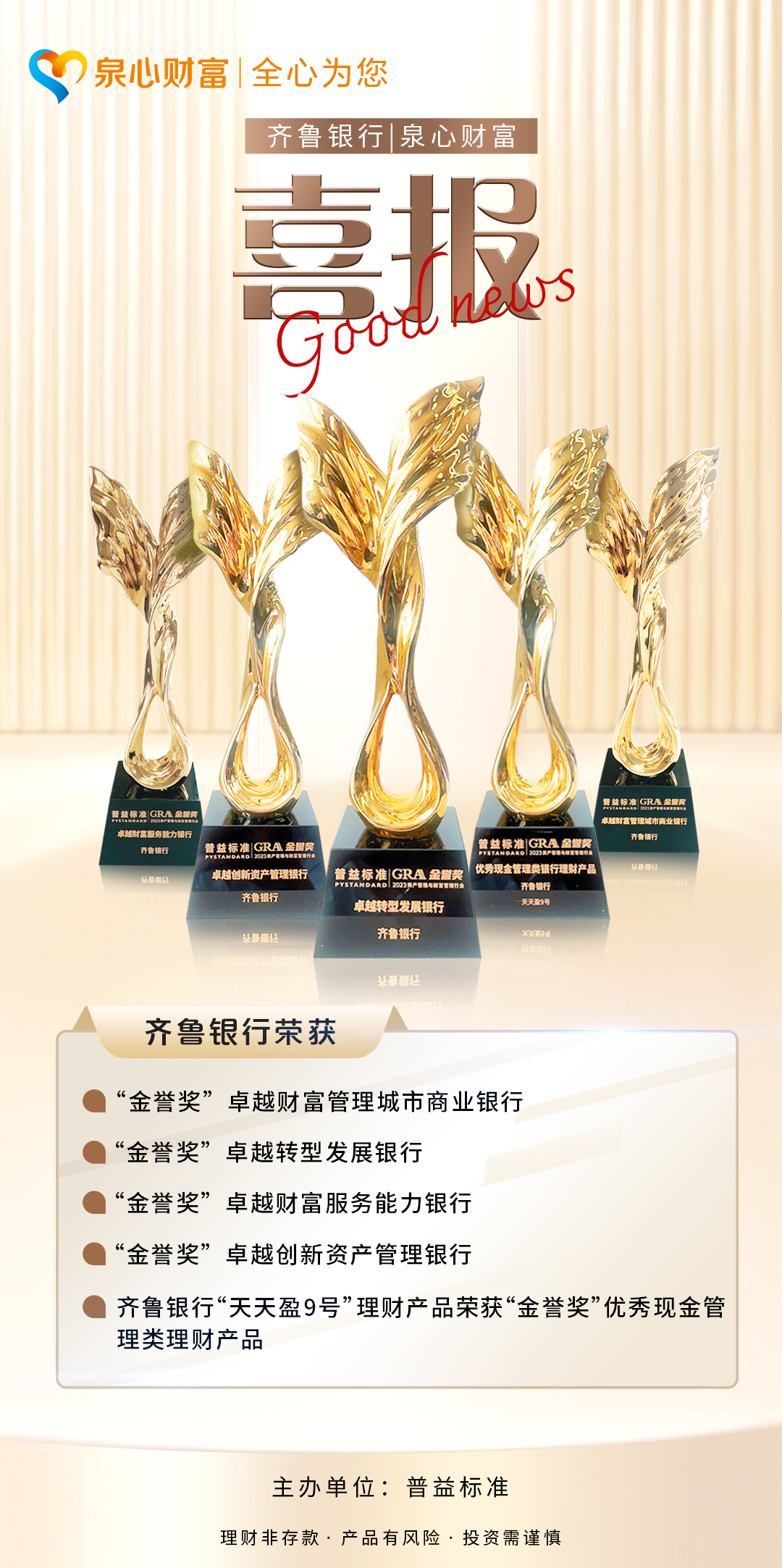 2023年6月16日,在普益标准主办的资产管理与财富管理行业发展大会暨第三届“金誉奖”颁奖盛典上,齐鲁银行凭借在财富管理领域的综合优势、优异的财富品牌影响力,荣获“卓越财富管理城市商业银行”“卓越转型发展银行”“卓越财富服务能力银行”“卓越创新资产管理银行”奖项。齐鲁银行“天天盈9号”理财产品荣获“优秀现金管理类理财产品”奖项。
