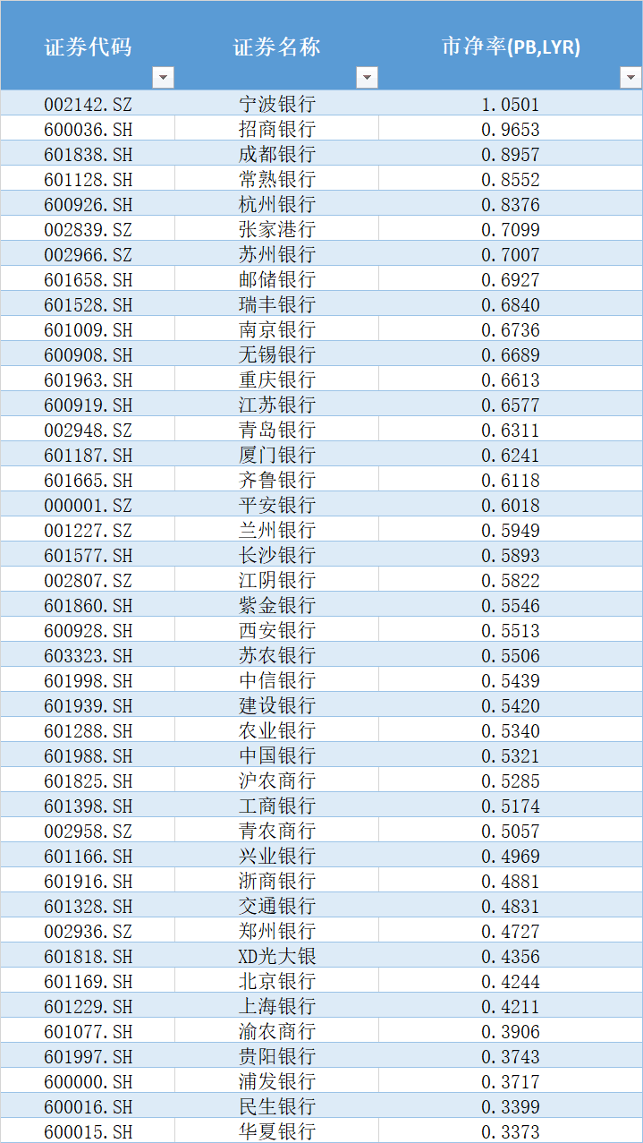 上市银行股价普遍走低。Choice数据显示,截至7月19日,A股42家上市银行中仅有宁波银行的市净率高于1倍,为1.05倍。12家上市银行的市净率低于0.5倍。其中,华夏银行、民生银行市净率分别为0.33、0.32倍。