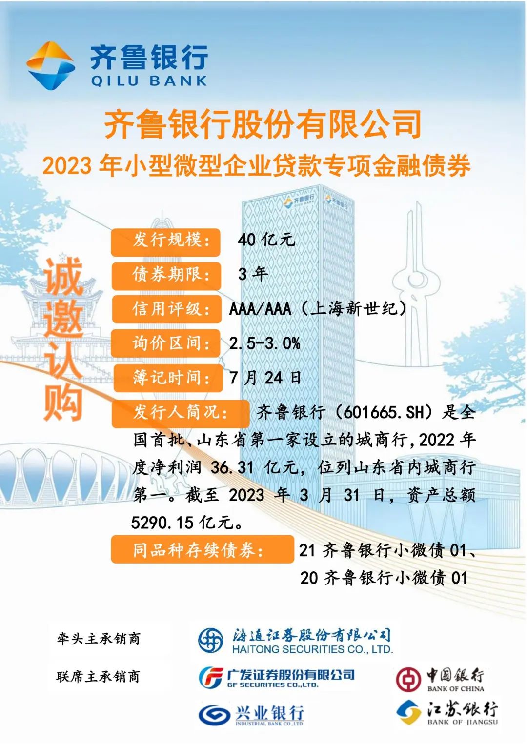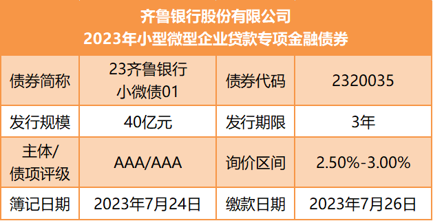 2023年7月24日,齐鲁银行股份有限公司将在全国银行间债券市场发行2023年小型微型企业贷款专项金融债券。本期债券的发行总额为人民币40亿元,期限为3年期,主体评级为AAA,债项评级为AAA。本次债券的募集资金将依据适用法律和监管部门的批准,用于发放小型微型企业贷款,为小微企业提供金融服务。