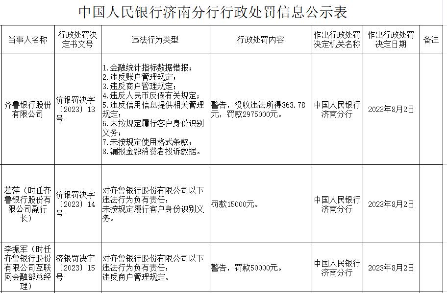 央行网站近日公布的中国人民银行济南分行行政处罚信息公示表(行政处罚决定书文号:济银罚决字〔2023〕10号)显示,齐鲁银行股份有限公司(简称“齐鲁银行”,股票代码“601665”)存在以下违法行为类型:1.金融统计指标数据错报;2.违反账户管理规定;3.违反商户管理规定;4.违反人民币反假有关规定;5.违反信用信息提供相关管理规定;6.未按规定履行客户身份识别义务;7.未按规定使用格式条款;8.漏报金融消费者投诉数据。中国人民银行济南分行对齐鲁银行警告,没收违法所得363.78元,罚款2975000元。
