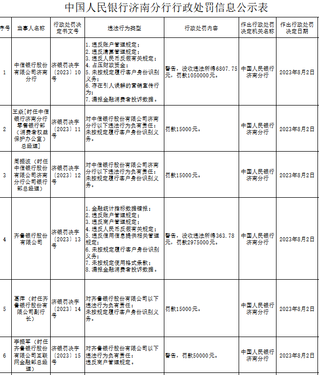 日前,中国人民银行济南分行发布的一则行政处罚信息公示表显示,中信银行(601998.SH)济南分行存在“违反账户管理规定;违反清算管理规定;违反人民币反假有关规定;占压财政资金;未按规定履行客户身份识别义务;存在引人误解的营销宣传行为;漏报金融消费者投诉数据”的违法违规事实,中国人民银行济南分行对中信银行济南分行作出“罚款105万元,没收违法所得6807.75元,并警告”的处罚决定;对责任人王焱、周振波分别罚款1.5万元。