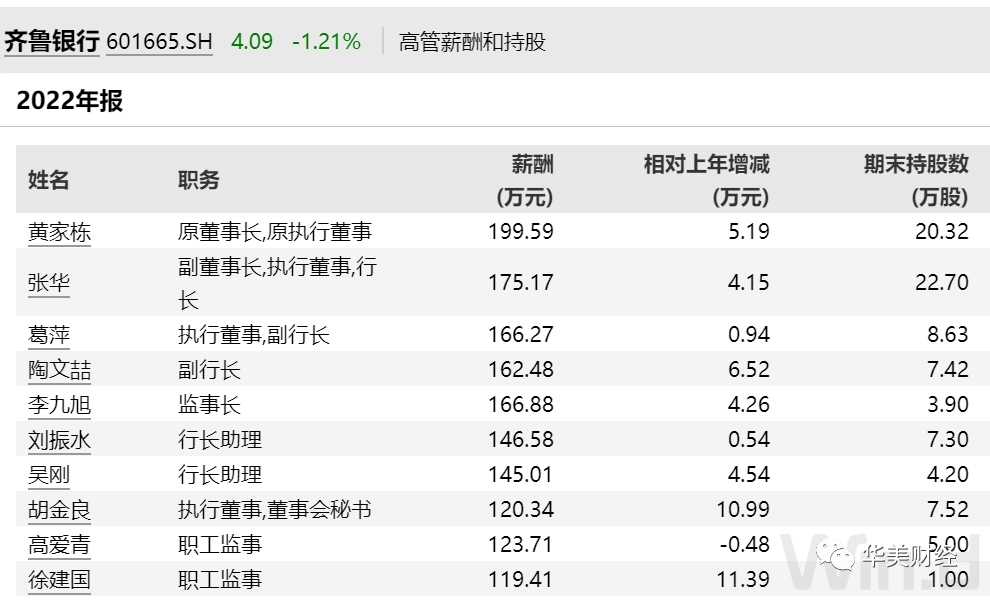 年报显示,去年原董事长黄家栋以近200万元薪酬领跑,行长张华也超过175万元,其他高管和多名监事薪酬超过百万元。
