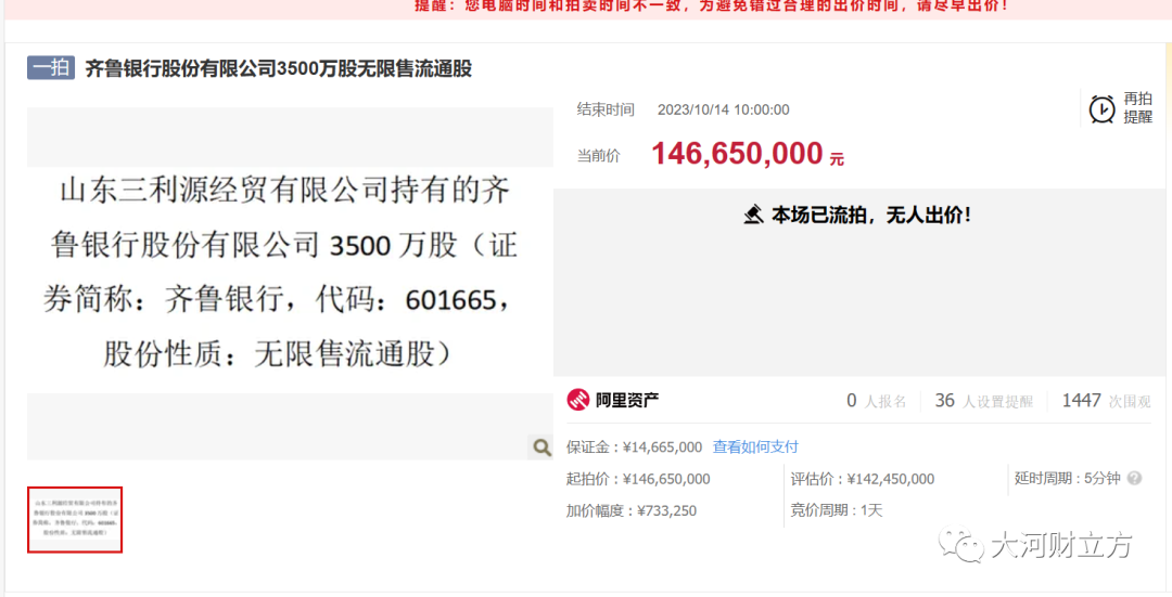 10月13日,阿里拍卖界面显示,齐鲁银行本次拍卖标的为3500万股,起拍价为14665万元,较评估价14245万元高了420万元,对应均价为4.19元/股,略高于齐鲁银行当日收盘价4.18元/股。但最终因无人报名参与竞拍而流拍。