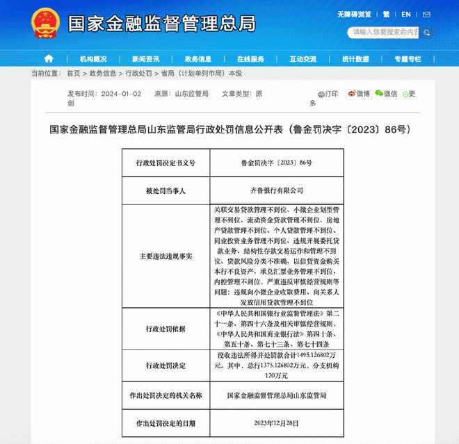 近日,齐鲁银行有限公司因存在严重违反审慎经营规则、违规向小微企业收取费用、向关系人发放信用贷款管理不到位等违法违规事实,被没收违法所得并处罚款合计1495.126802万元,其中总行被罚1375.126802万元、分支机构被罚120万元。